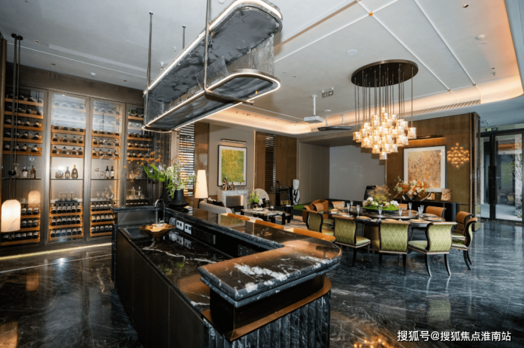 HWCD 团队以国际视野扎根江南文化, 用奢石铺陈出显性的高端质感,空间里随处可见的玉石元素,呼应“玉以载德”的中式底蕴,水纹图形点缀其间。