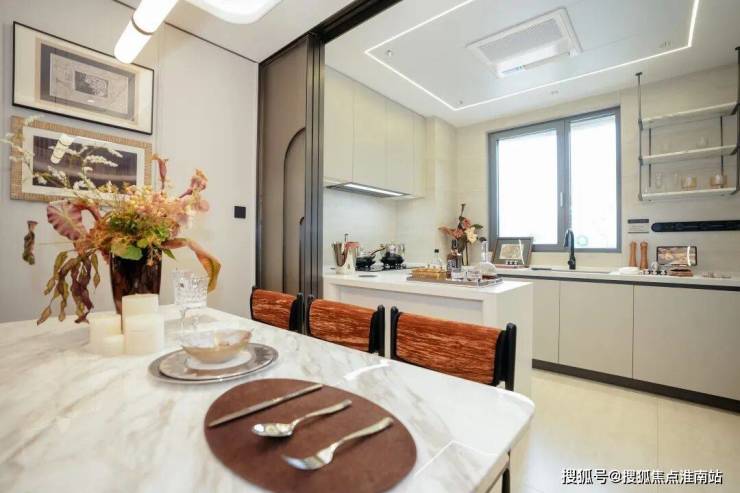 厨房配置中央空调,操作台面配置 轨道插座,岛台台面安装 升降插座,方便随时添置小家电,甚至插座上面还是一个 无线充电面板。