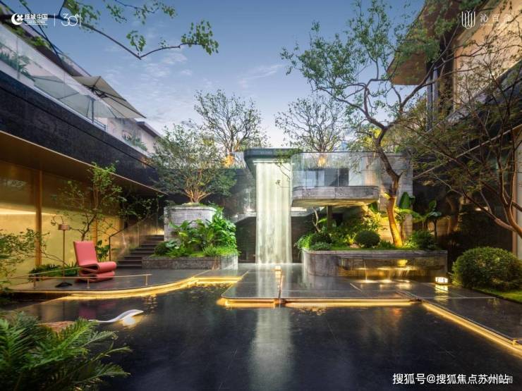 下沉庭院内,4颗丛生大乌桕围合,约5米高悬挑飞瀑灵动,搭配羽毛枫、镜面树池,营造度假酒店般的松弛与私密,归家仪式感与情绪价值拉满。