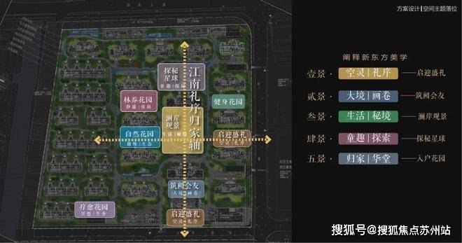 以江南人文精神为源点,打造两轴一环五进空间,江南礼序归家轴串联启迎盛礼、筑阙会友、归家华堂等5重礼制,尊崇归家;健康运动轴以24小时跑道为社区活力生活环,串联儿童乐园、长者康养、疗愈花园等10大生活场景,营造全龄全时的江南诗意生活。