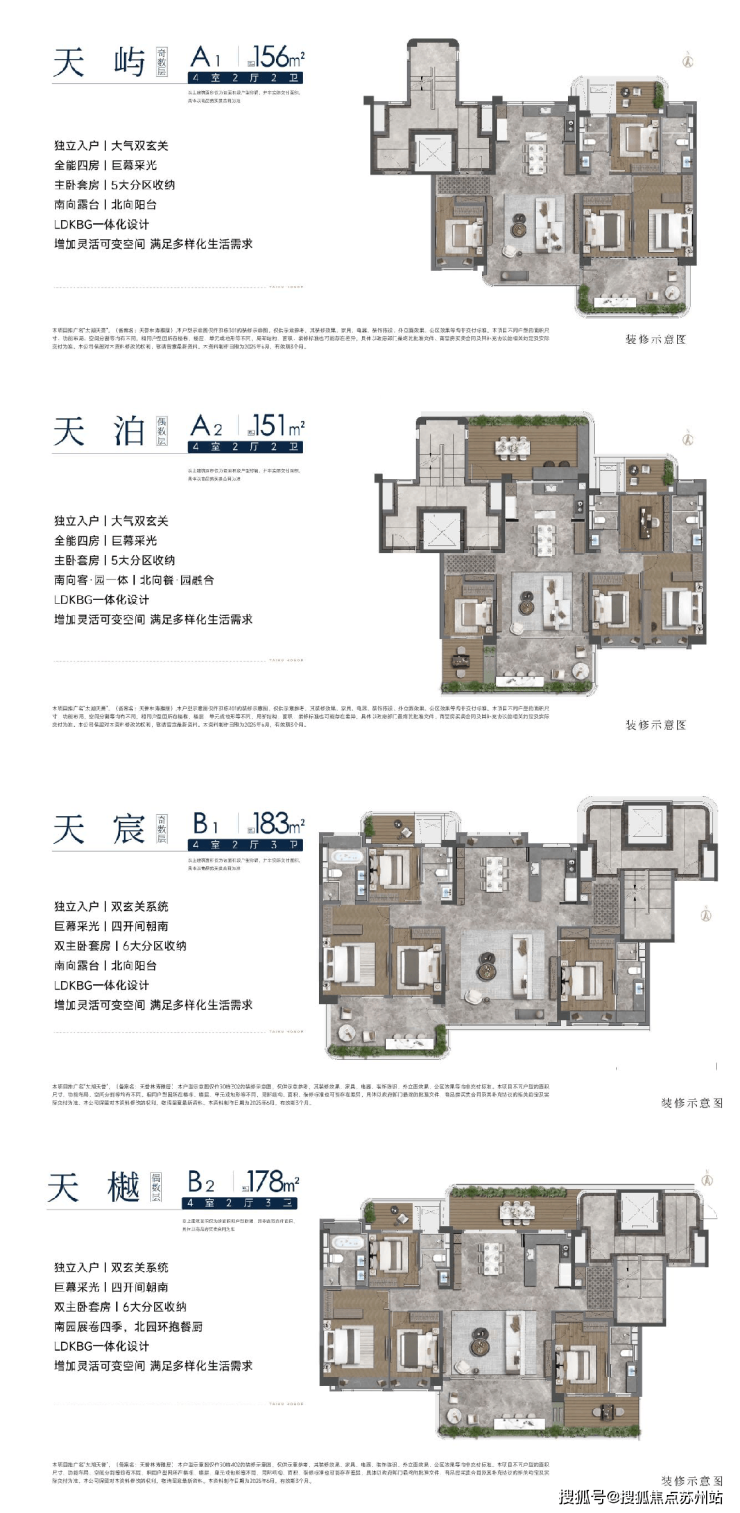 项目户型设计充分考虑现代家庭的生活需求,太湖天誉洋房产品面积从151㎡到188㎡,太湖天誉叠院产品面积从198㎡到213㎡,满足不同家庭的居住需求。