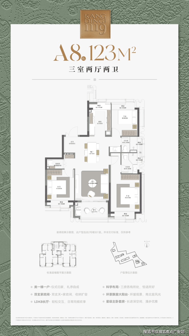 最重要的是,康定壹拾玖这建面约177㎡4房不仅仅是方正,更是飞机户型,三开间朝南+南北通透+无走道的浪费,整个户型相当正气。