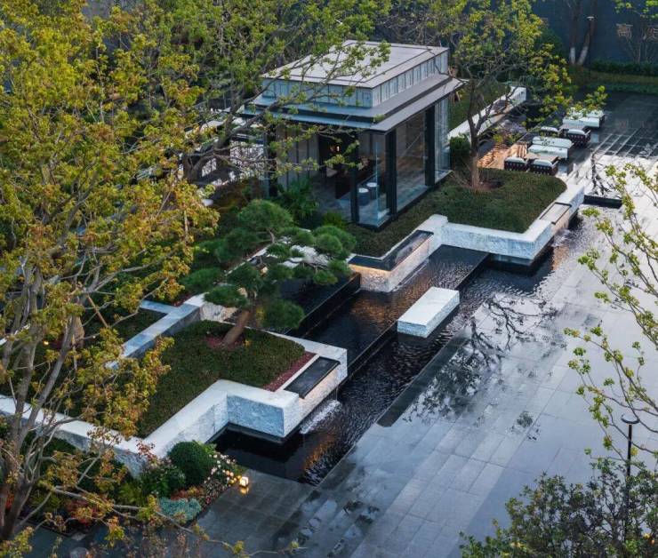 嵌落在各个景观组团中的户外会客厅,搭配大块深色石材地面铺装,呈现出景观与房屋融为一体的世纪府宅。