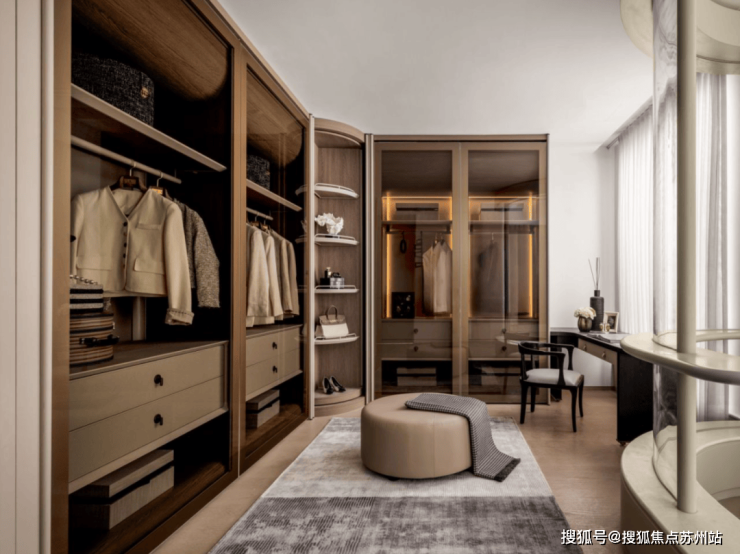 超豪华主卧大面积衣帽间,有专属X空间可以拓展多重功能,比如办公、阅读、品茶等: