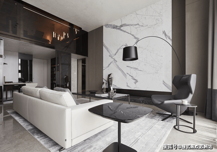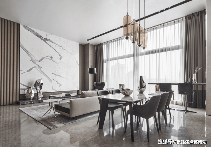 占据整体居所视觉中要的,是以鱼肚白大理石构成的客厅背景墙,线条明晰,行云流水,宛若破晓山涧,都市中突显的自然气息。
