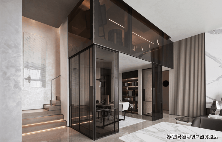 大片深棕色落地玻璃,使整体宛如生长在室内的建造物,结构强烈,与空间有机结合。