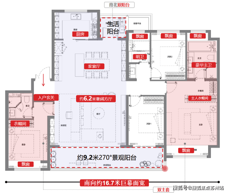 约182㎡户型,四房两厅三卫,约16.7米巨幕南向开间,大面宽,短进深,堪称是改善客户“头等舱”。 整体四卧均朝南、两个南向套房,兼顾老人和小孩,都可以住阳光房。南北双阳台,不仅通风透气,几乎全屋都可以瞰景!