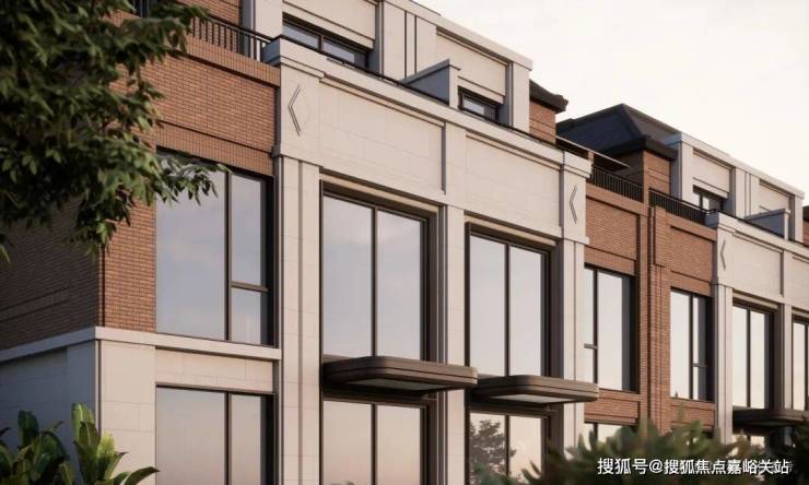 立面沿袭了嘉佩乐酒店的红砖元素,腰线运用深古铜色铝板,提取山墙、几何装饰等里弄建筑符号,以独具海派文化底蕴的红砖造艺,延续墅居经典三段式立面结构。