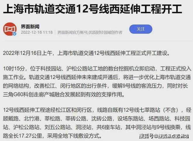 目前12号线西延伸正在加速推进,预计2027年底开通试运营。12号线西延伸在松江境内从G60云廊沿沈砖公路,东西向穿过洞泾,设沪松公路和刘五公路设站,在洞泾站与9号线交汇。