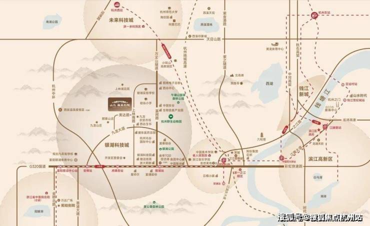 项目位于银湖科技城融杭门户,抢占交通资源高地,约1500米连接杭州地铁6号线虎啸杏站,瞬达杭州主城核芯.毗邻G320国道与彩虹快速路西延段,形成快速融杭交通走廊.