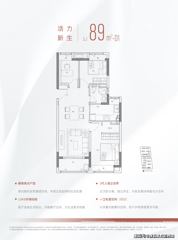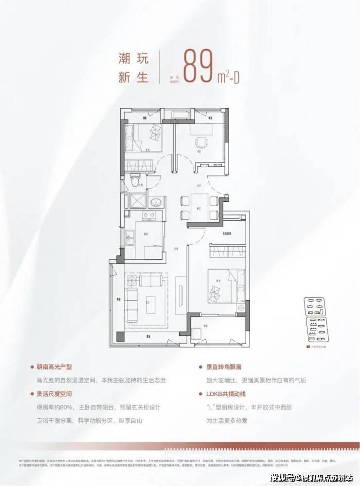 建面约89㎡3房,除了前面说到的三开间户型,还有一个两开间户型,基本见不到面积浪费,空间利用到极点!