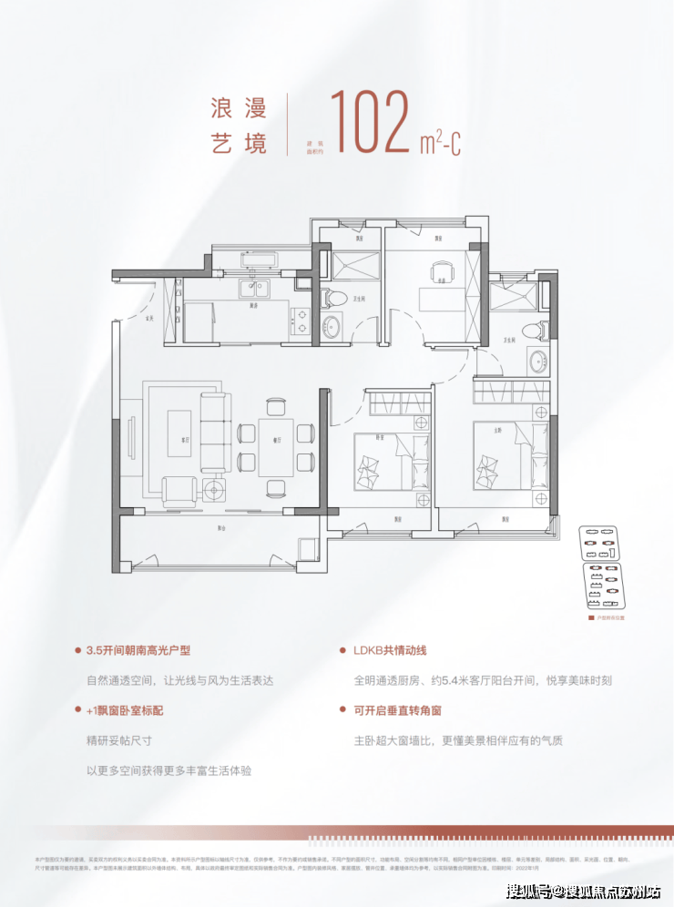 102㎡三房两厅两卫的舒适户型, 约5.4m横厅设计,3.5开间朝南,得房率约80%左右;每间房均有飘窗, 全屋飘窗共享有额外的面积约13㎡,在市场上也是少有的产品。