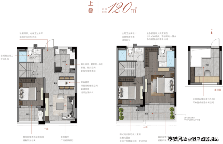 中叠入户电梯直达车库,超大露台入户。户外露台可以种植四季花卉,也可以打造成家庭烧烤区,家人朋友在这里聚会闲聊,享受闲暇时刻。;
