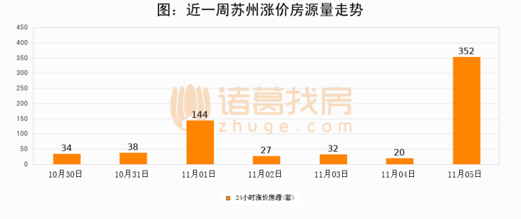 根据诸葛找房数据显示,苏州24小时涨价房源量为352套,较11月04日增加332套,环比上涨1660%。与此同时,涨价房源占比小幅扩大,业主信心有所提升。