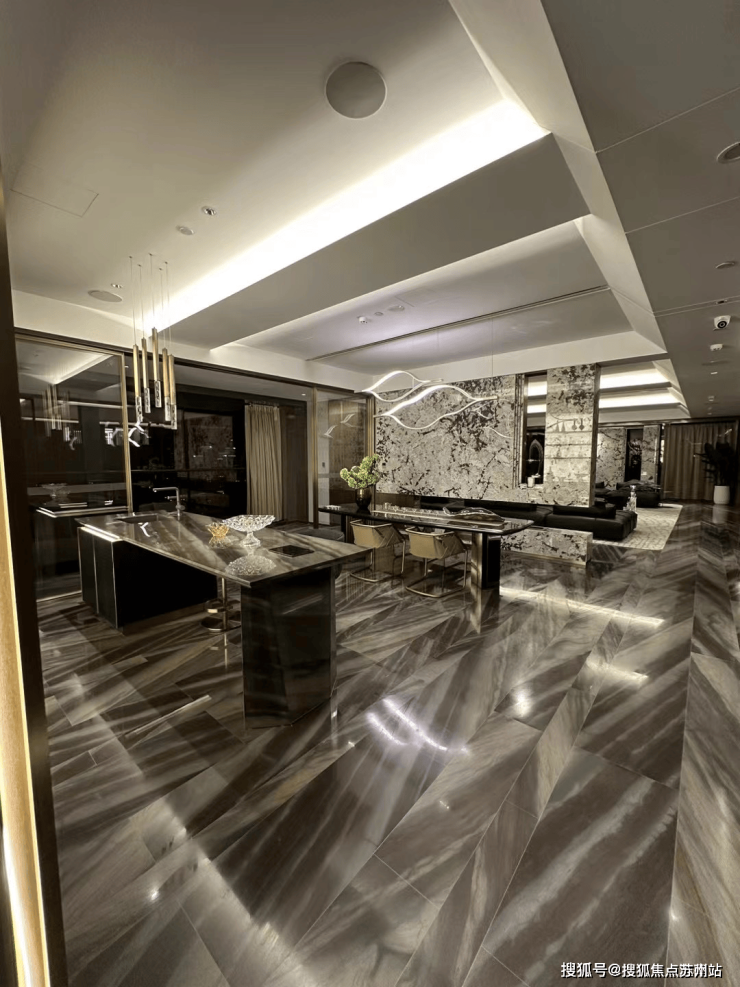 比如采用奢石静雅棕石、雪山银狐石、月光白石、挪威木纹石等昂贵石材;