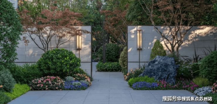 以天然温润石材为基底,采用中轴对称布局,展现豪门风范,水景中涌泉潺潺,配合星光闪烁的灯光效果,转角处设有精致的艺术景墙,营造出尊贵的归家体验。
