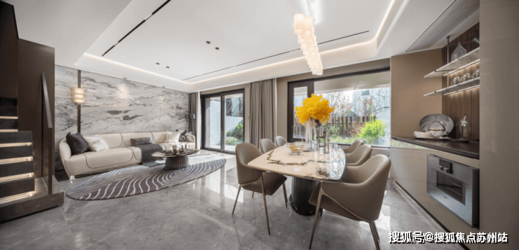 该项目已实景呈现,令人赞叹:联排别墅采用全石材外立面和超大栋距设计,营造出一方天与地共存的生活空间。外立面使用素白色花岗岩石材,尽显豪宅气质。建筑的造型线脚采用深咖色铝板,整体风格呈现出江南水墨画般的意境。
