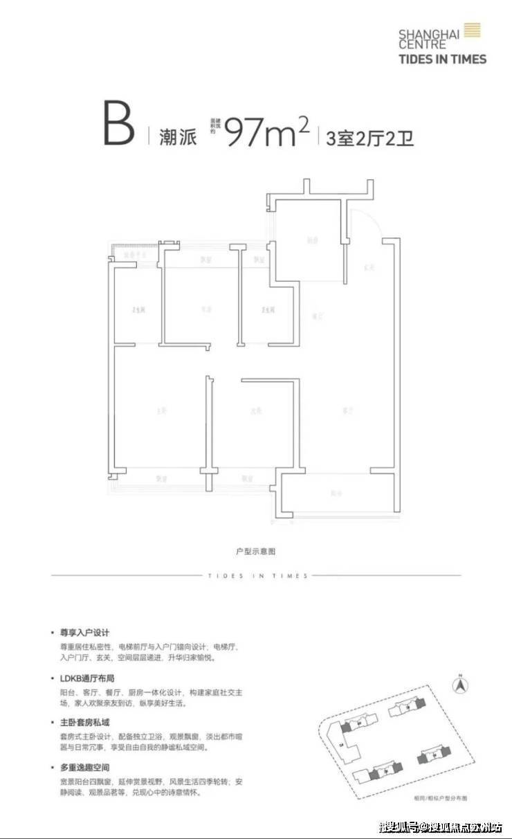 建面约95-97㎡3房2卫,2卫的设计保证了早晚高峰抢厕所的问题,并且主卧套房设计也保证了主人的私密空间。