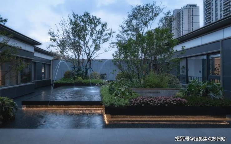 步步深入光影交织的艺术廊道,在流动式的半开放布局中,构建了以水为媒,连续而流动的庭院空间,镜面般的水景上跳跃着涌泉、在虚实互映的空间中,弥漫着静谧的氛围。水景之上点缀的乔木、让艺术画境般的氛围中充盈自然之美。