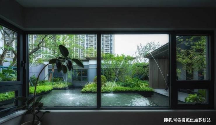 伫立窗前,草木繁盛,树影婆娑,水声潺潺、水天相衬,天光一色。眼前的景象犹如微缩的山水画般栩栩如生,静谧的空间里传递着雅致、诗意的空间氛围。