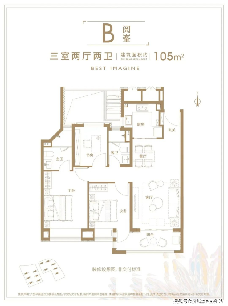 建面约105㎡三房两厅两卫户型,整个设计户型方正,动静分离,三开间朝南,全明格局,带超大景观阳台;主卧套房设计,尺度感和私密性兼具;而且还是双卫设计,全屋带飘窗,延展了使用空间,兼具舒适性和空间感,堪称初改首选。