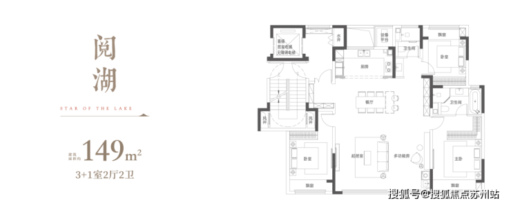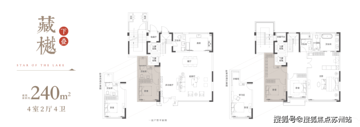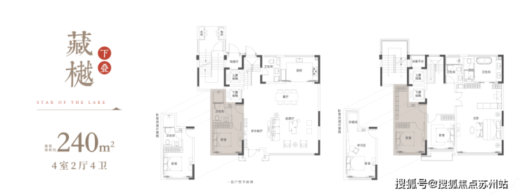 在横向空间,阅湖之星实现了三开间朝南、多采光面设计,让叠墅拥有大平层的奢阔感。我们以建面约240㎡下叠为例: