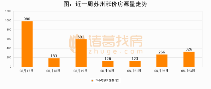 根据诸葛找房数据显示,苏州24小时涨价房源量为326套,较08月22日增加60套,环比上涨22.6%。与此同时,涨价房源占比小幅扩大,业主信心有所提升。