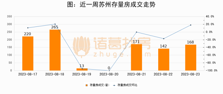 从存量房来看,2023年08月23日苏州存量房单日成交168套,比昨日增加26套,环比上涨18.3%。从近一周存量房成交来看,苏州存量房日均成交套数为139套,08月23日单日成交168套,高于近一周平均水平20.9%。