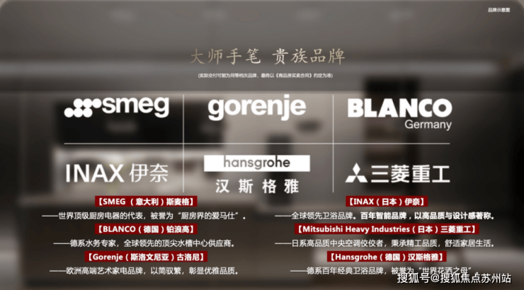 臻选SMEG/劳芬/古洛尼/伊奈/铂浪高/三菱重工/威能/汉斯格雅/杜拉维特等国际一线大牌(具体以商品房买卖合同为准),以至高规格的精装修标准,塑造高颜值、高配置、高舒适度的居住空间。