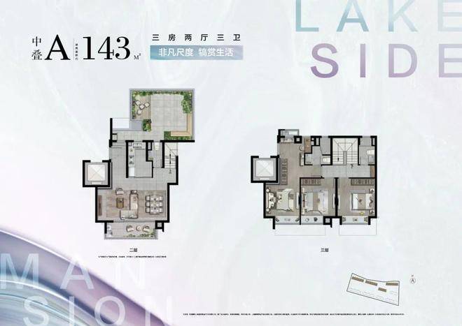 中叠A户型:建面约143㎡ ,三房两厅三卫