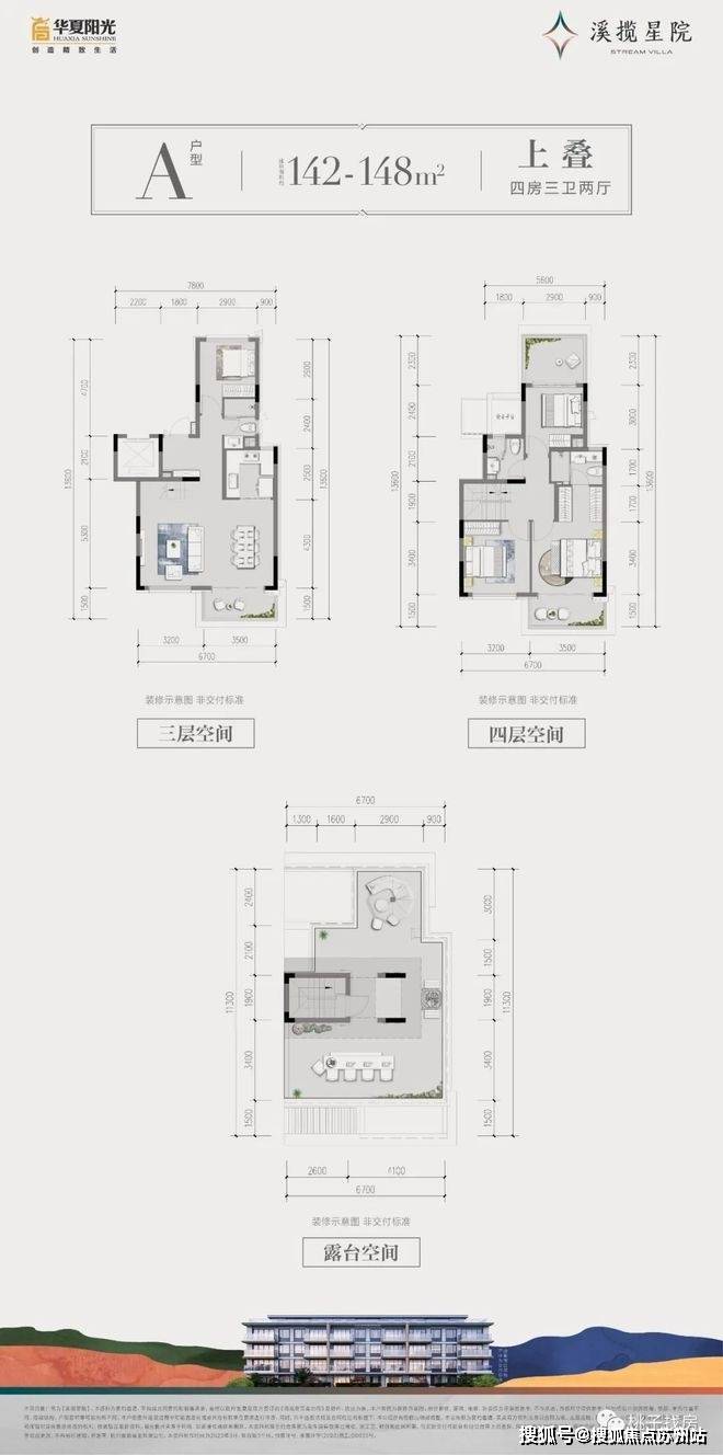 建面约142~148㎡上叠:约6.7m餐客连厅/豪华主卧套房/顶层景观阳台/U型厨房
