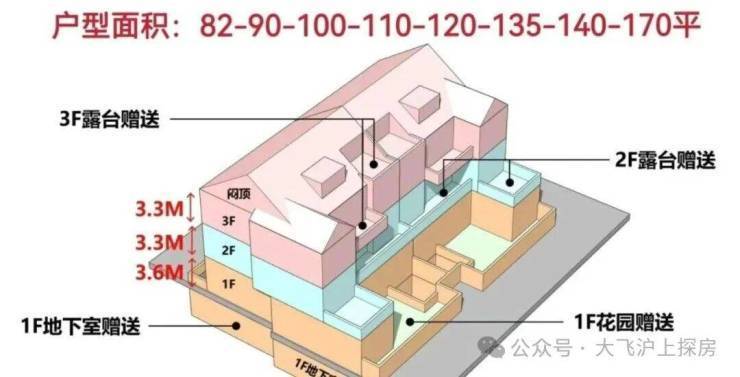 更狠的是,洋房主力建面为一楼约174㎡,二楼约138㎡,三楼约128㎡;另外还有一些建面约80-115㎡的小户型洋房。