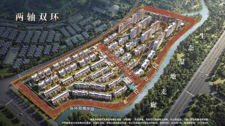 而且项目整个地块三面都被绿地与河道包裹,尤其是项目东侧,公共绿地、滨河景观带、城市生态走廊此地排列,天然具备构建多层次景观视域的条件。