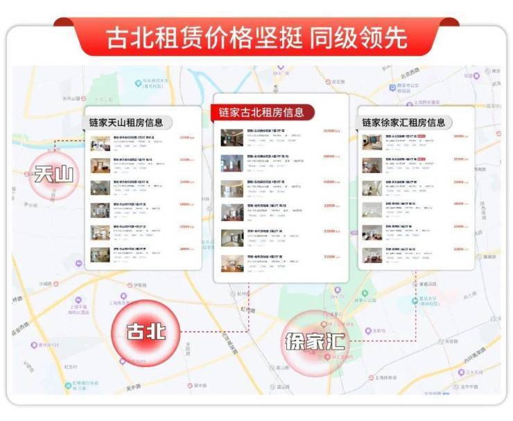 此外,古北高租售比提升性价比,如古北瑞仕花园165㎡月租超3万,高于天山、徐家汇。