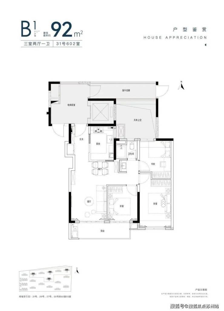 92m²户型,3开间朝南,双阳台设计,阳台的南向面宽接近6米,更具视觉延展性;