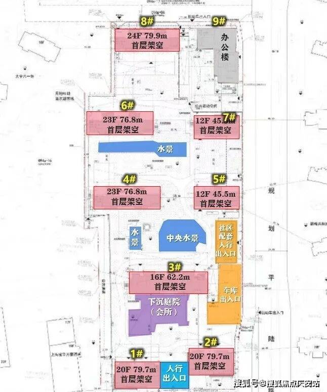 该方案亮点颇多,总计八幢高层和小高层设计,最南端的1#和2#楼均设置有私家泳池,而且还在19F采用了住宅楼当中较为少见的悬挑工艺,延伸出了一定的使用空间,个人预估这两幢会是配置大平层豪宅产品。