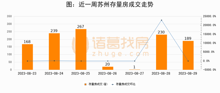 从存量房来看,2023年08月29日苏州存量房单日成交189套,比昨日减少41套,环比下降17.8%。从近一周存量房成交来看,苏州存量房日均成交套数为159套,08月29日单日成交189套,高于近一周平均水平18.9%。