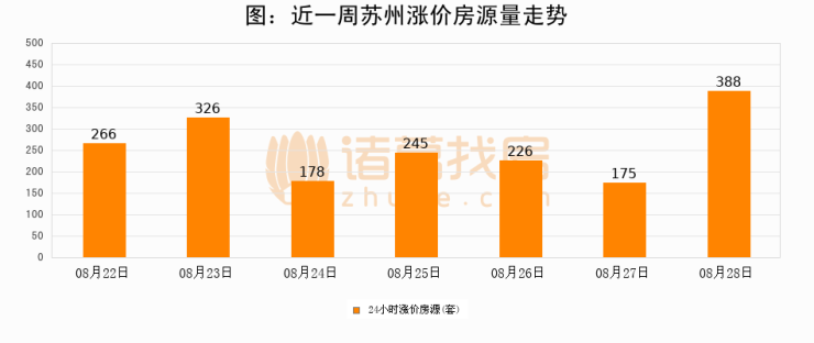 根据诸葛找房数据显示,苏州24小时涨价房源量为388套,较08月27日增加213套,环比上涨121.7%。与此同时,涨价房源占比小幅扩大,业主信心有所提升。