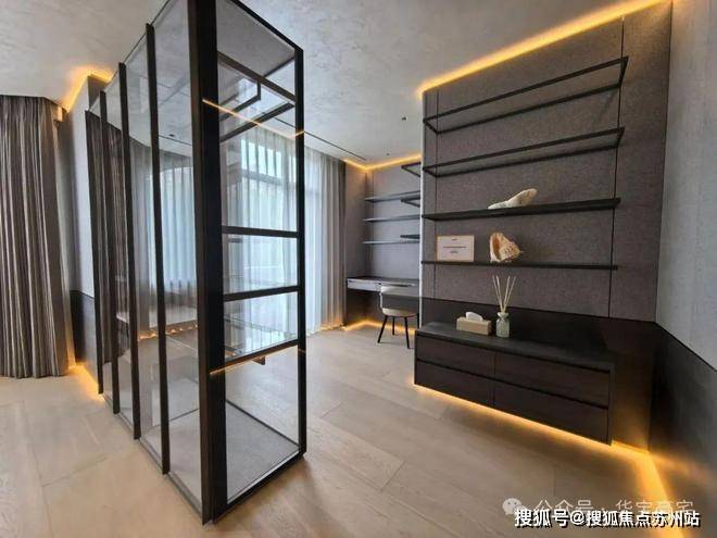 精致镂空床头柜,金属元素的点缀和背景墙金属线条形成呼应,用来营造空间的轻奢质感。
