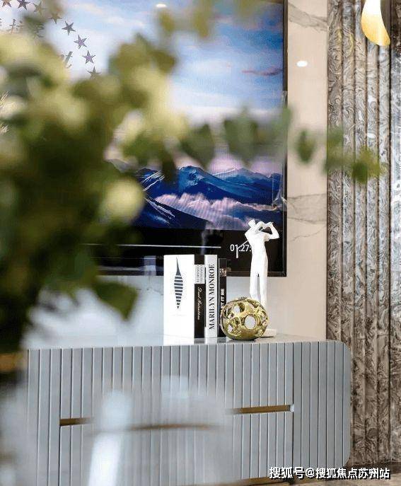 大理石的背景墙和金属线条元素相互搭配,营造空间的大气轻奢之感。灰色的色调,表现出复古优雅的空间氛围。
