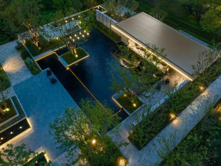 园林设计:借鉴苏州传统园林风格,环形曲廊串联景观轴线,300㎡中央戏水池和下沉式会所