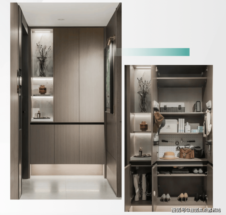 进门预留玄关设置,玄关柜开放格以及底部镂空方便家庭使用;柜体内部增加洞洞板方便业主不同场景收纳,未来可以放置钥匙,随身小物件等;