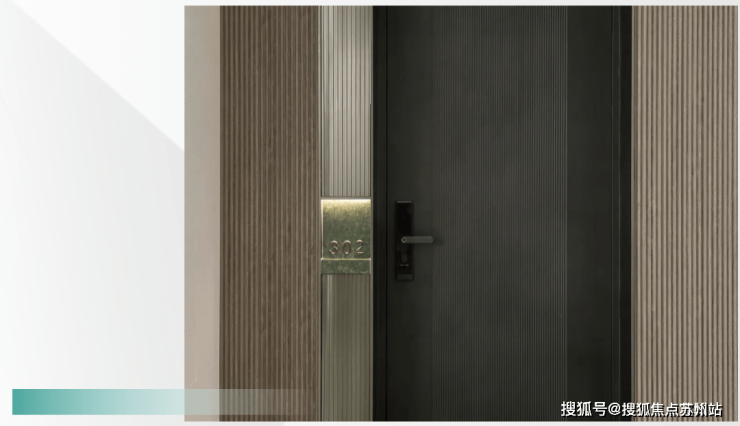 以入户门举例,传统入户门多使用单一金属门框配涂料,而在万科朗拾|玉湖149㎡户型中,入户门采用酒店式一体化设计,不锈钢门套+ 房号岩板装饰,配合灯光,营造酒店式归家感觉;全屋采用无缝墙布铺贴,相比传统墙纸工艺,整体更感更强,且不易起皮开裂。