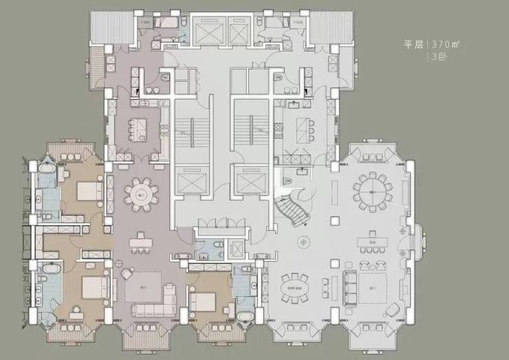 以2号楼为例总高39层;实际住宅36层;1栋楼分2个单元每个单元2梯2户;每两个楼层2个单元共6户大宅,370㎡平层(两个楼层2个单元共4套),680㎡复式(两个楼层2个单元共2套)另传最终交付时候可能会有户型定制