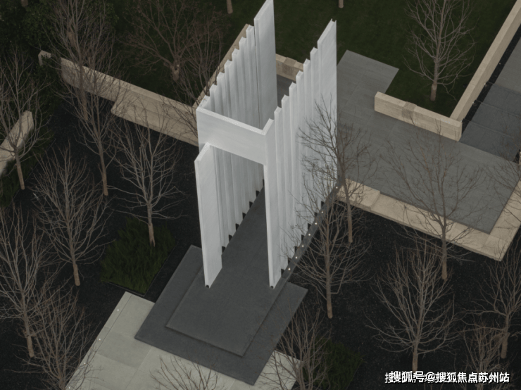 穿过公园进入社区前场,仪式感铺面,类高奢酒店设计,约10米高的「精神之门」矗立。
