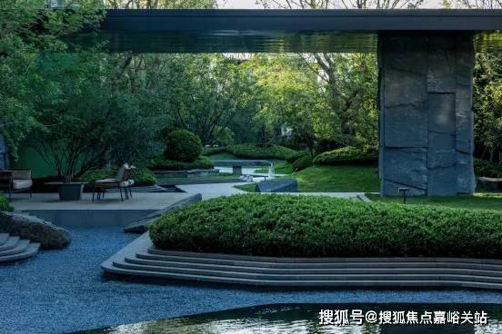 第二进——珠翠回廊:以水面景观为主体,利用富有度假感的河桦与静水面打造极具特色的前场景观,廊中水景上树阵的设计,营造出了丰富的景观空间、增添归家仪式感。