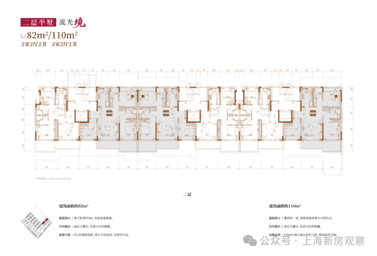 项目主打3层的超低密洋房产品,另有3套联排产品,户型类型丰富;洋房为创新的多层退台式洋房,层高高于传统常规洋房产品,3.3-3.6m层高对标别墅产品层高.