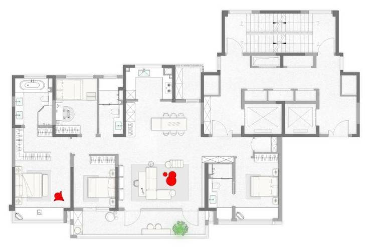 建面约 242㎡ 4 房 2 厅 3 卫:终极改善标杆户型,约 20.7 米南向面宽 + 80㎡超大餐客厅,轻松承载家族聚会与商务会客;双朝南行政级主卧套房,均配备独立卫浴与衣帽间,三卫全明设计,最大化保障隐私与舒适。