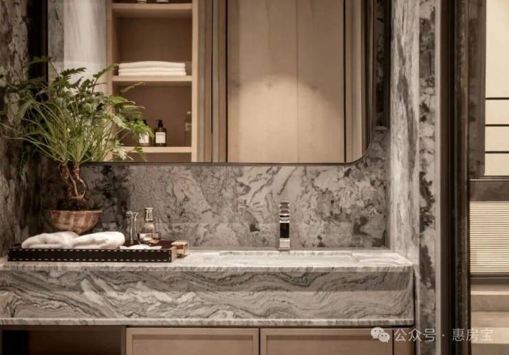 主卫更是奢华感拉满,TOTO高端系列NEOREST智能一体座便器(与华尔道夫等高端酒店同款)、唯宝台下盆,搭配汉斯格雅旗下高端子品牌&雅生系列龙头+花洒——要知道该系列可是宝格丽酒店、前滩华尔道夫酒店的同款配置,每一次洗漱都是星级体验.其次是奢石与贵价材质的大面积运用.
