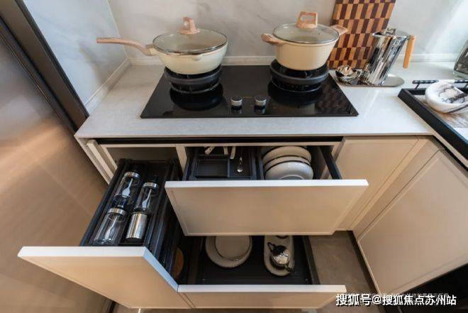 还配备大量收纳系统,例如多功能拉篮、定制亚光翻边造型柜体等。